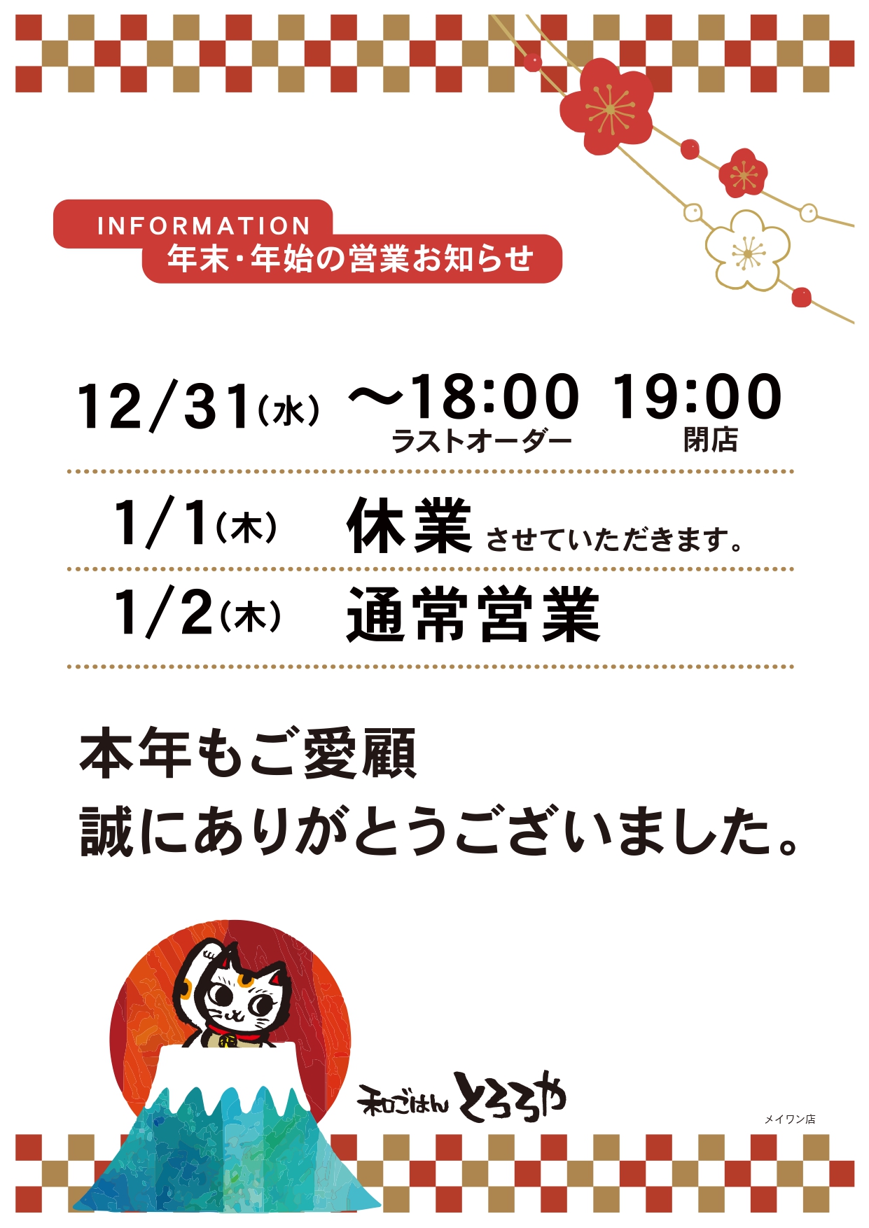 メイワン店 年末・年始営業のお知らせ