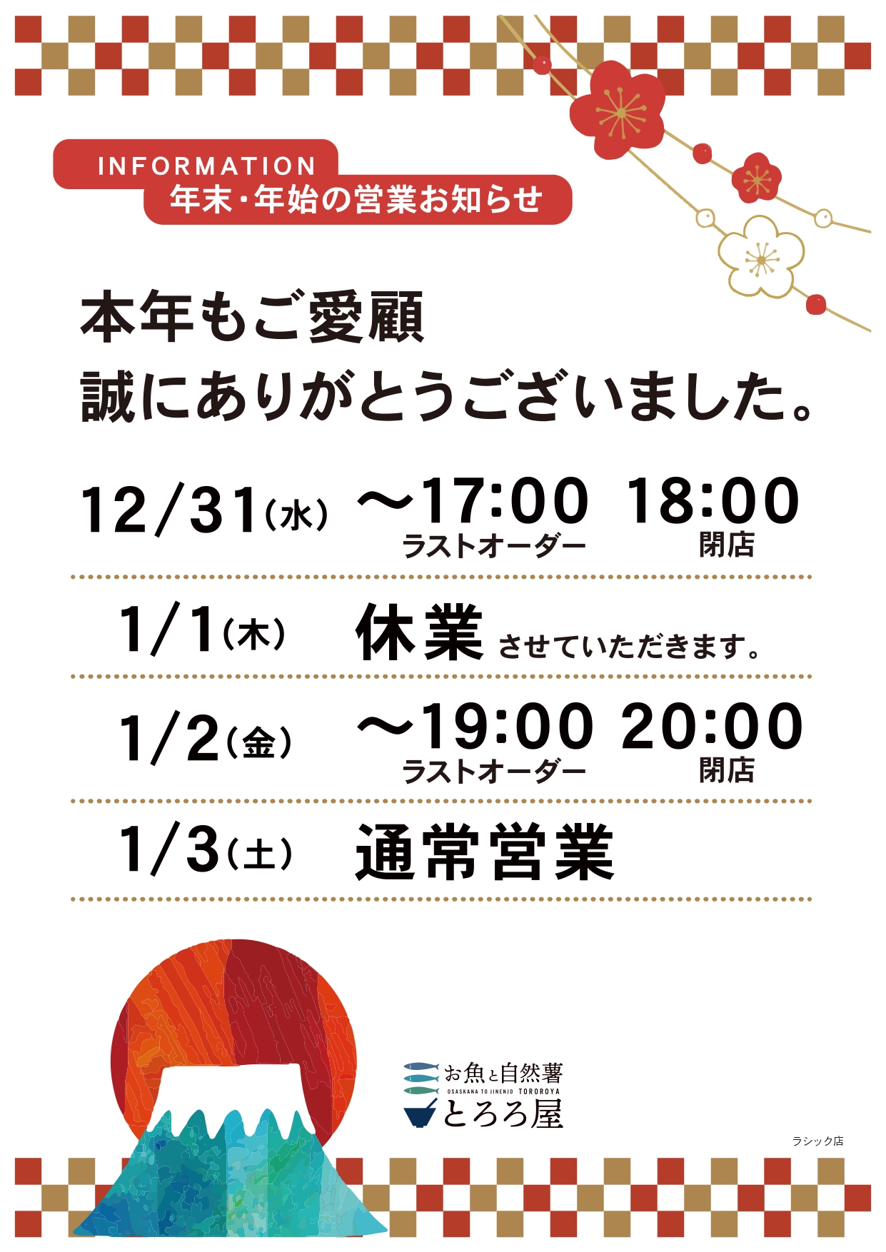 ラシック店 年末・年始営業のお知らせ
